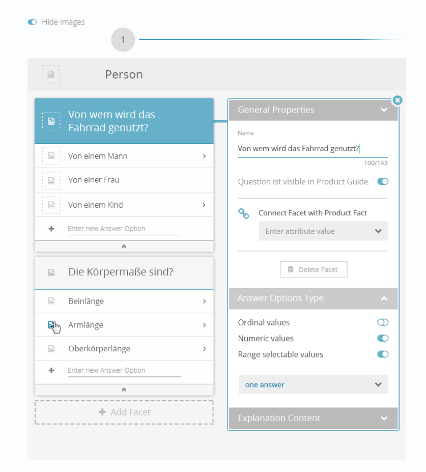 Diese Ein- und Ausblendelogik wird in der Konfigurationssoftware direkt an der entsprechenden Facet oder dem jeweiligen State (Antwortoption) konfigurert. In einem späteren Schritt ist es auch möglich das Empfehlungsverhalten zu modellieren.